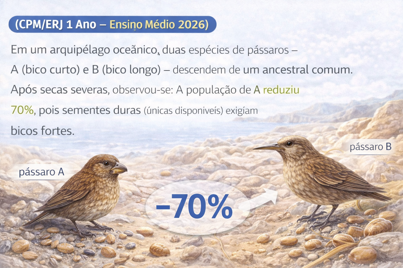 (CPM/ERJ 1 Ano – Ensino Médio 2026) Em um arquipélago oceânico, duas espécies de pássaros – A (bico curto) e B (bico longo) – descendem de um ancestral comum.